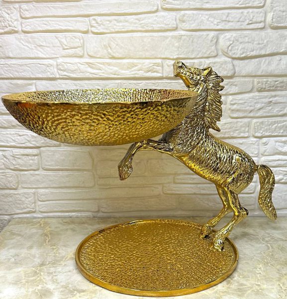 کاسه چکشی اسب پرشی طلایی/نقره ای با میوه/آجیل/شیرینی یک هدیه زیبا و ماندگار برای هر مناسبتی است. این اسب خیره کننده و باشکوه با میوه/آجیل/شیرینی پر شده است و مطمئناً مورد توجه همه قرار خواهد گرفت.